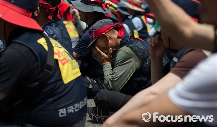(서울=포커스뉴스) 전국건설노동조합 조합원이 6일 오후 서울역광장에서 총파업 집회에 앞서 건설사 직접 시공제 도입 등 18대 대정부 요구안 제시를 촉구하는 구호를 외치던 중 고개를 숙이고 있다.