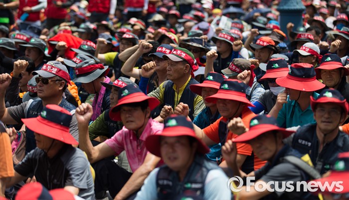 (서울=포커스뉴스) 전국건설노동조합 조합원들이 6일 오후 서울역광장에서 총파업 집회에 앞서 건설사 직접 시공제 도입 등 18대 대정부 요구안 제시를 촉구하는 구호를 외치고 있다.
