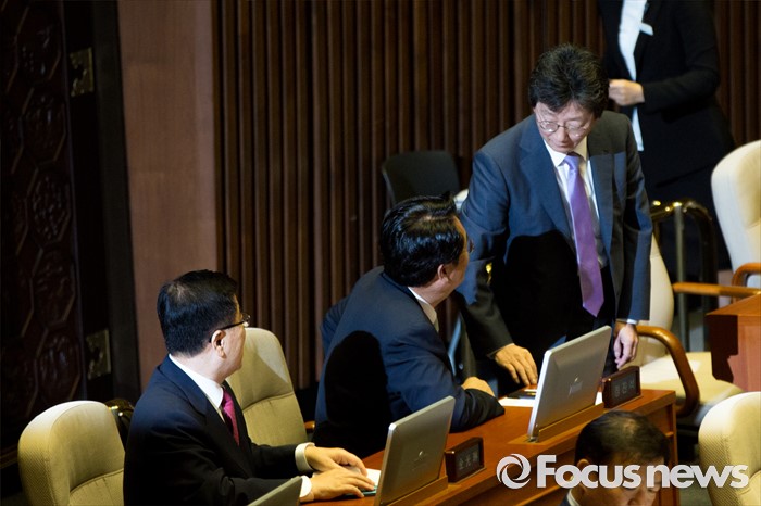(서울=포커스뉴스) 정진석(왼쪽 두 번째) 새누리당 원내대표와 유승민(오른쪽) 새누리당 의원이 6일 오후 서울 여의도 국회에서 열린 '제343회 국회(임시회) 제8차 본회의'에 참석해 대화 하고 있다.