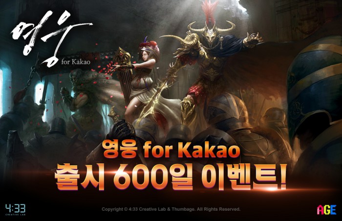 (서울=포커스뉴스) 네시삼십삼분(대표 장원상, 박영호, 이하 4:33)은 모바일 액션 RPG(역할수행게임) '영웅 for Kakao'(개발사 썸에이지)의 정식 오픈 600일을 기념해 특별한 이벤트를 진행한다고 6일 밝혔다.