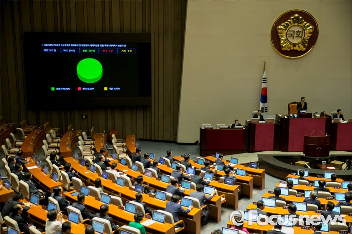 (서울=포커스뉴스) 6일 오후 서울 여의도 국회에서 열린 343회 국회(임시회) 8차 본회의에서 가습기살균제 사고 국정조사계획서 승인의 건이 재석 250인 중 만장일치로 통과되고 있다.