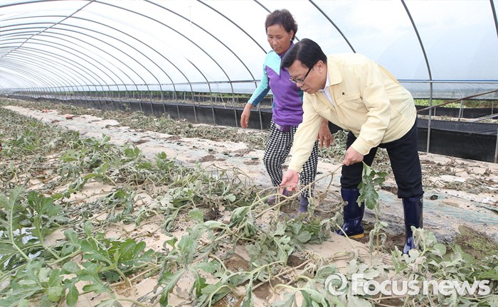 (부여=포커스뉴스) 이동필 농림축산식품부 장관이 6일 오후 집중호우로 수해를 입은 충남 부여 정동리 수박 비닐하우스를 찾아 수해를 입은 농작물을 살펴본 뒤 농민들의 애로사항을 듣고 있다.