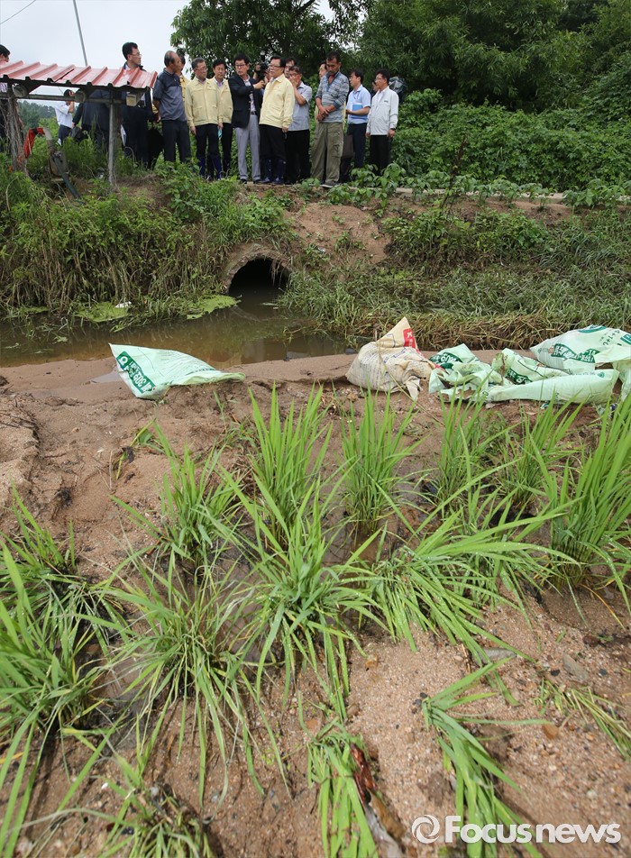 (부여=포커스뉴스) 이동필 농림축산식품부 장관이 6일 오후 집중호우로 수해를 입은 충남 부여 정동리 수박 비닐하우스를 찾아 수해를 입은 농작물을 살펴본 뒤 농민들의 애로사항을 듣고 있다.