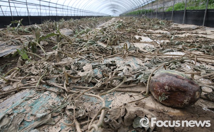 (부여=포커스뉴스) 6일 오후 집중호우로 수해를 입은 충남 부여 정동리 수박 비닐하우스에서 농작물이 말라죽어 있다. 이날 이동필 농림축산식품부 장관은 농작물 수해지역과 농민의 애로사항을 점검했다.