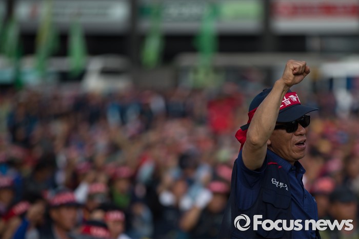 (서울=포커스뉴스) 6일 오후 서울 중구 서울시청광장에서 열린 '건설노동자 총력투쟁 결의대회'에 참석한 조합원들이 안전한 건설현장을 촉구하며 구호를 외치고 있다.