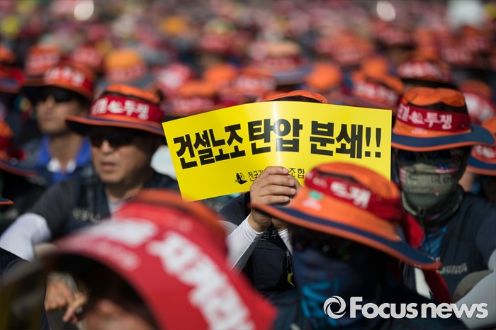 (서울=포커스뉴스) 6일 오후 서울 중구 서울시청광장에서 열린 '건설노동자 총력투쟁 결의대회'에 참석한 조합원들이 안전한 건설현장을 촉구하며 구호를 외치고 있다.