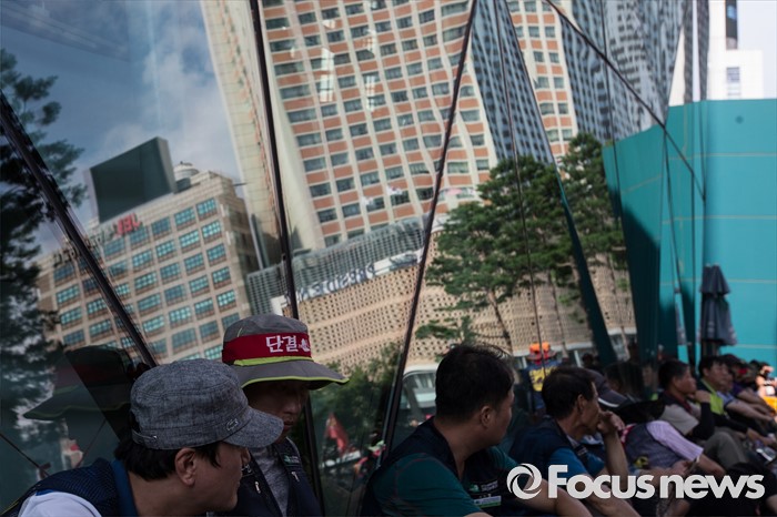 (서울=포커스뉴스) 6일 오후 서울 중구 서울시청광장에서 열린 '건설노동자 총력투쟁 결의대회'에 참석한 조합원들이 광장 인근에서 휴식을 취하고 있다.