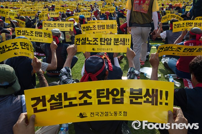 (서울=포커스뉴스) 6일 오후 서울 중구 서울시청광장에서 열린 '건설노동자 총력투쟁 결의대회'에 참석한 조합원들이 안전한 건설현장을 촉구하며 구호를 외치고 있다.