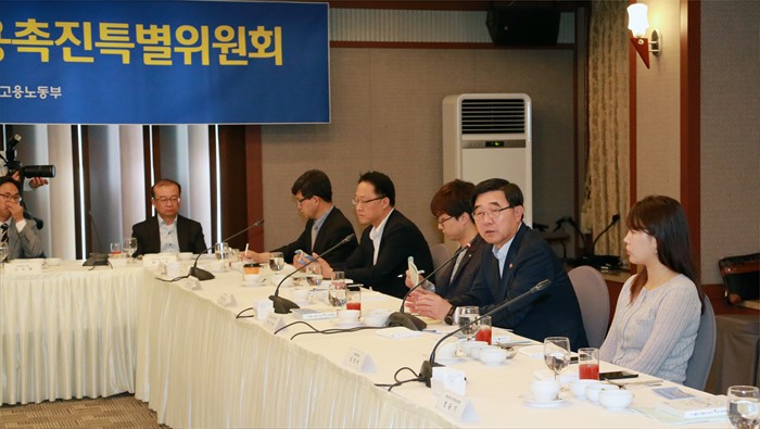 (서울=포커스뉴스) 이기권 고용노동부 장관이 6일 오전 서울 중구 세종대로 프레스센터에서 열린 2016년 제2차 청년고용촉진특별위원회 회의에서 참석자들과 인사 후 모두발언을 하고 있다. <사진제공=고용노동부>