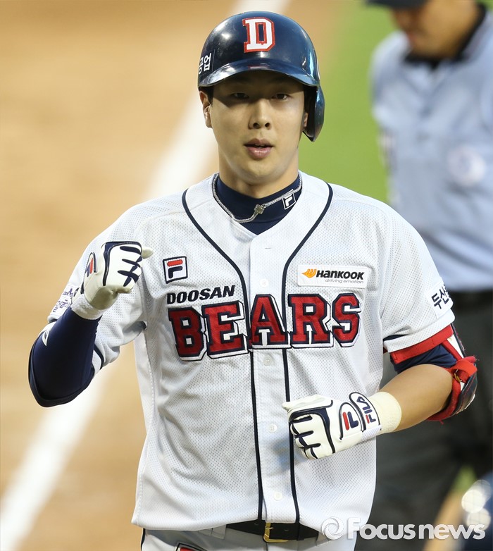 (서울=포커스뉴스) 6일 서울 잠실구장에서 열린 2016 프로야구 넥센-두산 경기 4회말 1사 1루에서 두산 박건우가 우월 2점 홈런을 치고 홈인하고 있다.