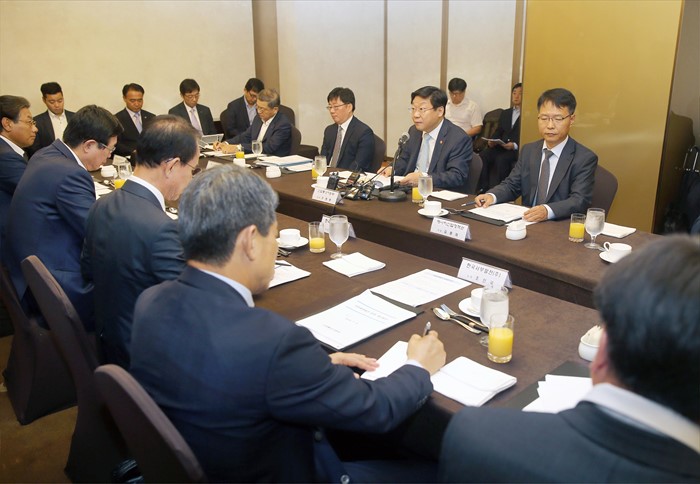 (서울=포커스뉴스) 주형환 산업통상자원부 장관이 6일 서울 팔래스호텔 다이너스티홀에서 채희봉산업부 에너지자원실장, 정창길 중부발전 사장, 조인국 서부발전 사장, 김용진 동서발전 사장, 허 엽 남동발전 사장, 윤종근 남부발전 사장과 산업부 관계자가 참석한 가운데 열린 석탄화력발전 대책회의를 주재하고 있다. <사진제공=산업통상자원부>