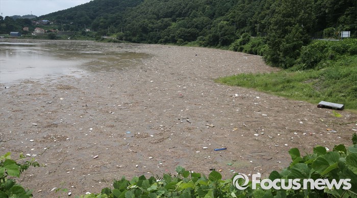(옥천=포커스뉴스) 중부지방에 내린 집중호우로 7일 오전 충북 옥천군 군북면 대청호일대에 많은 양의 쓰레기 유입돼 있다.