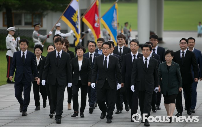 (서울=포커스뉴스) 박지원 국민의당 비상대책위원장과 비대위원 등이 7일 오전 동작구 국립서울현충원을 방문해 현충탑 참배를 위해 이동하고 있다.