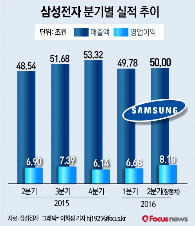 (서울=포커스뉴스) 7일 삼성전자가 공시한 올해 2분기 매출액은 50조원으로 전년동기비 3.01% 증가했다. 영업이익은 8조1000억원(잠정실적)으로 2014년 1분기 이후 9분기만에 8조원대로 올라섰다.