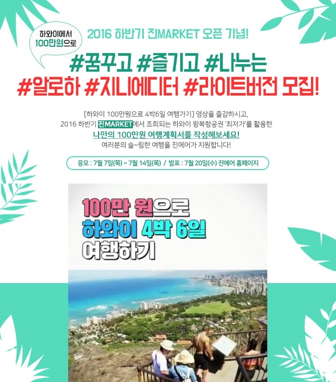 '100만원으로 하와이 4박 6일 여행가기'라는 주제로 계획서를 만들어 개인 SNS에 올린 후 진에어에 응모하면 경품을 증정한다. 계획서에는 진에어의 인천~호놀룰루 특가 노선 항공 스케줄이 포함돼야 한다.