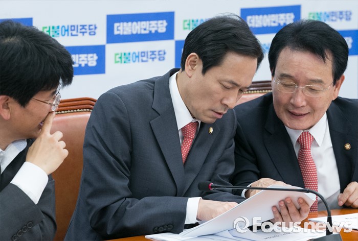 (서울=포커스뉴스) 7일 오전 서울 여의도 국회에서 열린 더불어민주당 정책조정회의에 참석한 우상호(가운데) 원내대표와 변재일(오른쪽) 정책위의장, 박완주 원내수석부대표가 대화하고 있다.