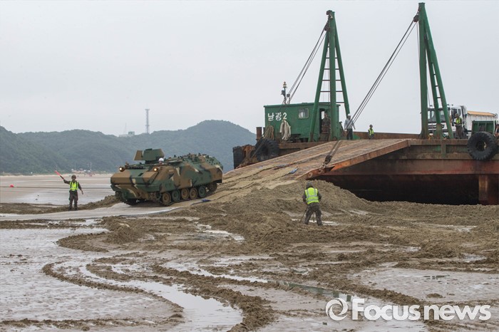 (태안=포커스뉴스) 7일 오전 충청남도 태안군 안면읍 인근 해안에서 2016 합동 해안양륙군수지원(J LOTS) 훈련이 열리고 있다. 합동참모본부 주관으로 해군과 해병대, 육군, 해경이 참가하는 합동 해안양륙군수지원 훈련은 항만 사용이 불가한 지역에서 작전을 수행중인 전투부대에 군수지운을 하기 위한 작전이다.
