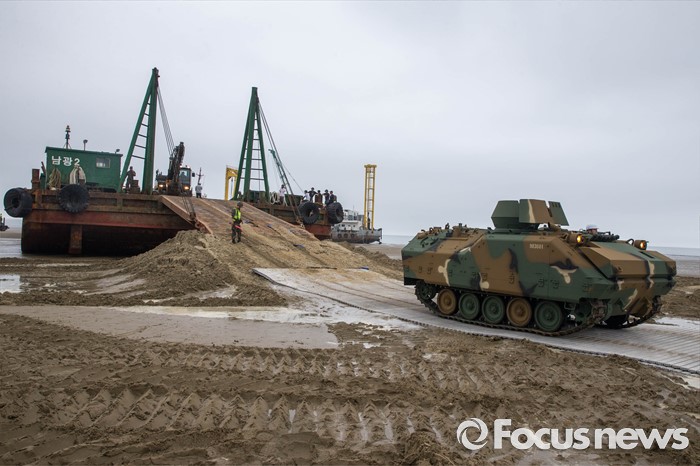 (태안=포커스뉴스) 7일 오전 충청남도 태안군 안면읍 인근 해안에서 2016 합동 해안양륙군수지원(J LOTS) 훈련이 열리고 있다. 합동참모본부 주관으로 해군과 해병대, 육군, 해경이 참가하는 합동 해안양륙군수지원 훈련은 항만 사용이 불가한 지역에서 작전을 수행중인 전투부대에 군수지운을 하기 위한 작전이다.