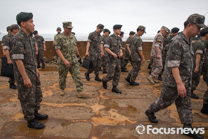 (태안=포커스뉴스) 7일 오전 충청남도 태안군 안면읍 인근 해안에서 2016 합동 해안양륙군수지원(J LOTS) 훈련이 열리고 있다. 합동참모본부 주관으로 해군과 해병대, 육군, 해경이 참가하는 합동 해안양륙군수지원 훈련은 항만 사용이 불가한 지역에서 작전을 수행중인 전투부대에 군수지운을 하기 위한 작전이다.