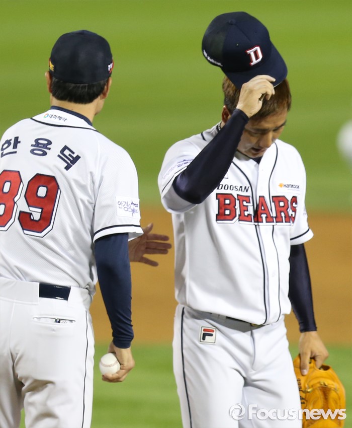 (서울=포커스뉴스) 6일 서울 잠실구장에서 열린 2016 프로야구 넥센-두산 경기 9회초 두산 투수 정재훈이 1실점하고 마운드를 내려가고 있다.