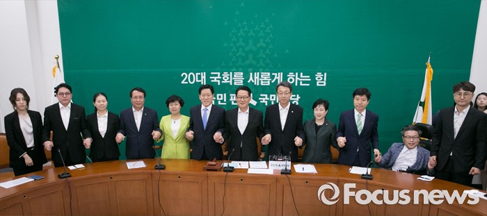 (서울=포커스뉴스) 7일 오전 서울 여의도 국회에서 열린 국민의당 첫 비상대책위원회의에 참석한 박지원 비대위원장과 비대위원들이 손을 잡고 취재진을 향해 포즈를 취하고 있다.