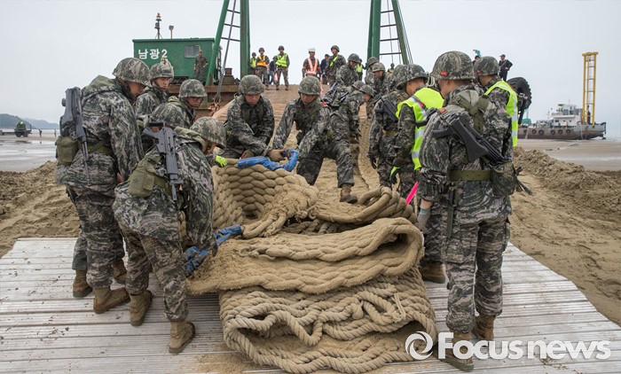 (태안=포커스뉴스) 7일 오전 충청남도 태안군 안면읍 인근 해안에서 2016 합동 해안양륙군수지원(J LOTS) 훈련이 열리고 있다. 합동참모본부 주관으로 해군과 해병대, 육군, 해경이 참가하는 합동 해안양륙군수지원 훈련은 항만 사용이 불가한 지역에서 작전을 수행중인 전투부대에 군수지운을 하기 위한 작전이다.