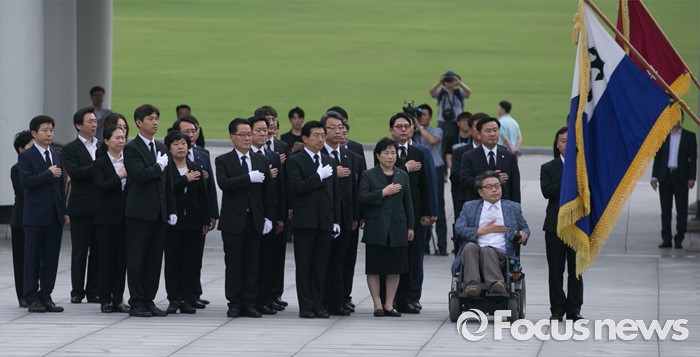 (서울=포커스뉴스) 박지원 국민의당 비상대책위원장과 비대위원 등이 7일 오전 동작구 국립서울현충원을 방문해 현충탑 참배에 앞서 국기에 대한 경례를 하고 있다.