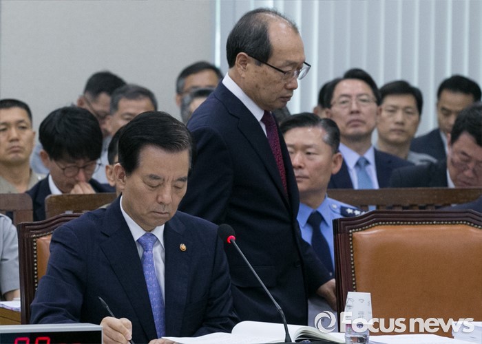 (서울=포커스뉴스) 7일 오전 서울 여의도 국회에서 열린 국방위원회 전체회의에 참석한 장명진 방위사업청장이 제안설명을 마친 뒤 자리로 향하고 있다. 왼쪽은 한민구 국방부 장관.