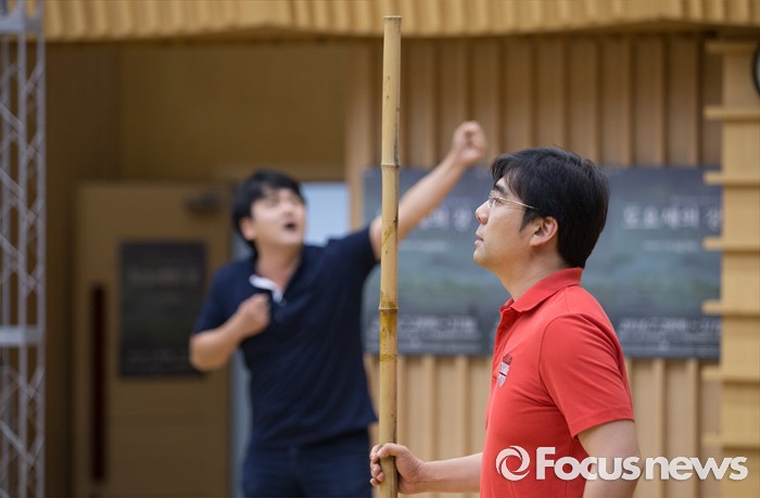 (서울=포커스뉴스) 7일 오후 서울 종로구 세종문화회관에서 열린 오페라 '도요새의 강' 제작발표회에 참석한 출연진이 장면을 시연하고 있다.