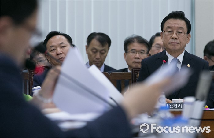 (서울=포커스뉴스) 7일 오전 서울 여의도 국회에서 열린 안전행정위원회 전체회의에 참석한 박인용(오른쪽) 국민안전처 장관이 의원들의 질의를 듣고 있다.