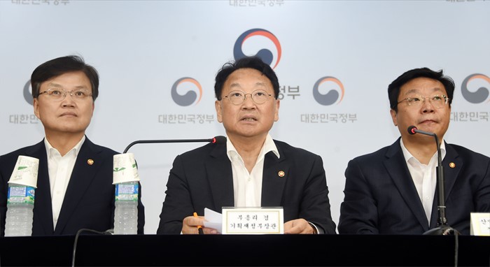 (서울=포커스뉴스) 유일호 부총리 겸 기획재정부 장관이 7일 서울 종로구 정부서울청사에서 '제10차 무역투자진흥회의' 결과 관계부처 합동브리핑에서 모두발언을 하고 있다. 왼쪽부터 최양희 미래부 장관, 유일호 부총리, 주형환 산업부 장관. <사진제공=기획재정부>