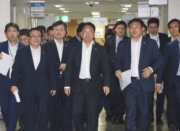 (서울=포커스뉴스) 유일호 부총리 겸 기획재정부 장관이 7일 서울 종로구 정부서울청사에서 '제10차 무역투자진흥회의' 결과 관계부처 합동브리핑을 하기 위해 브리핑장으로 향하고 있다. <사진제공=기획재정부>