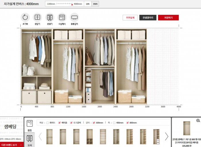 또한 한샘몰 옷장플래너 페이지에 방문하면 옷장을 배치할 공간사이즈와 수납에 맞게 옷장 몸통 구성, 도어를 선택할 수 있다.