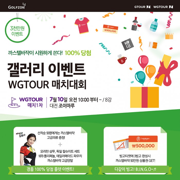골프존은 SNS(사회관계망서비스) 친구소환 이벤트, SNS 인증 이벤트, 까스텔바쟉 빙고, 경품추첨 이벤트, SMS(단문문자전송서비스) 선착순 이벤트 등 온·오프라인을 아우르는 다양한 행사를 통해 까스텔바쟉 파우치, 까스텔바쟉 50만원 상품권, 모리턴 샴푸 등을 갤러리에게 증정한다.