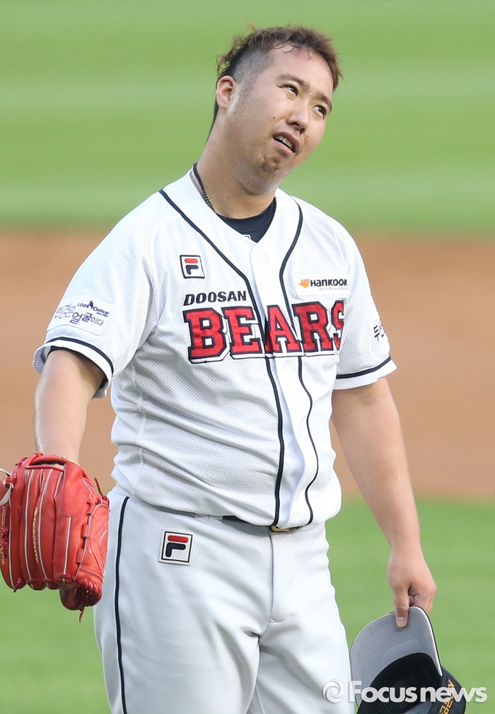 (서울=포커스뉴스) 6일 서울 잠실구장에서 열린 2016 프로야구 넥센-두산 경기 2회초 2사 1,2루에서 두산 투수 유희관이 넥센 이택근을 볼넷으로 진루시키고 아쉬워하고 있다.