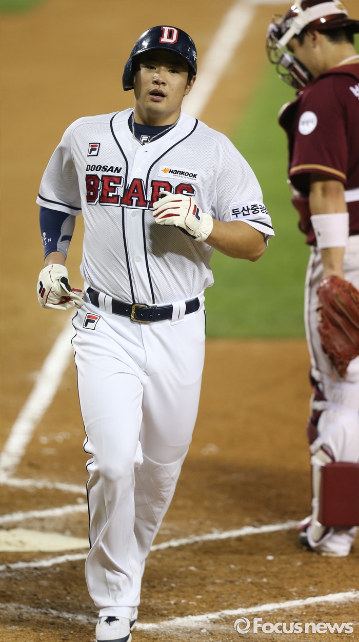 (서울=포커스뉴스) 6일 서울 잠실구장에서 열린 2016 프로야구 넥센-두산 경기 6회말 무사 3루에서 두산 3루주자 김재환이 에반스의 희생플라이때 홈인하고 있다.