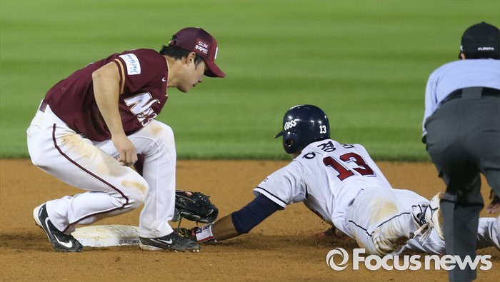 (서울=포커스뉴스) 6일 서울 잠실구장에서 열린 2016 프로야구 넥센-두산 경기 6회말 2사 1루에서 두산 1루주자 허경민이 2루 도루를 시도하다 넥센 김하성에게 태그아웃되고 있다.