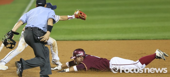 (서울=포커스뉴스) 6일 서울 잠실구장에서 열린 2016 프로야구 넥센-두산 경기 8회초 1사 2루에서 넥센 김하성의 좌익수 플라이 아웃때 2루주자 서건창이 3루에서 슬라이딩하며 세이프되고 있다.