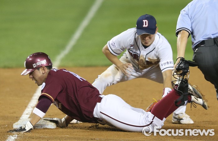 (서울=포커스뉴스) 6일 서울 잠실구장에서 열린 2016 프로야구 넥센-두산 경기 8회초 1사 2루에서 넥센 김하성의 좌익수 플라이 아웃때 2루주자 서건창이 3루에서 슬라이딩하며 세이프되고 있다.
