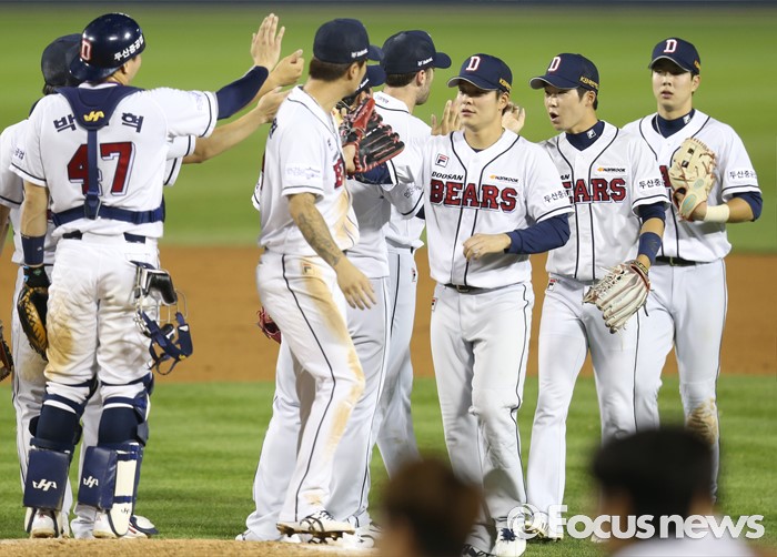 | △ 승리의 하이파이브하는 두산 선수들 |
