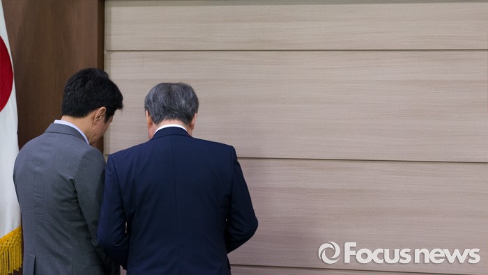 (서울=포커스뉴스) 8일 오전 서울 송파구 올림픽파크텔에서 열린 대한체육회 제4차 긴급 임시 이사회에서 강영중(오른쪽) 대한체육회 회장과 정몽규 리우올림픽 한국선수단장이 이야기를 나누고 있다. 이번 임시 이사회에서는 박태환의 리우 올림픽 출전 여부가 긴급 안건으로 상정됐다.