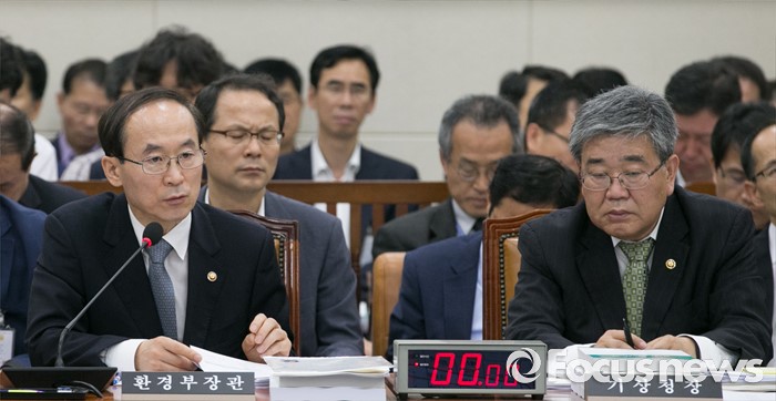 (서울=포커스뉴스) 8일 오전 서울 여의도 국회에서 열린 환경노동위원회 전체회의에 참석한 윤성규 환경부 장관이 의원들의 질의에 답하고 있다. 오른쪽은 고윤화 기상청장.