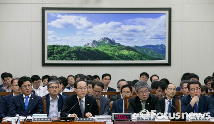 (서울=포커스뉴스) 8일 오전 서울 여의도 국회에서 열린 환경노동위원회 전체회의에 참석한 윤성규(왼쪽 두번째) 환경부 장관과 고윤화(오른쪽 두번째) 기상청장 등이 의원들의 질의를 듣고 있다.