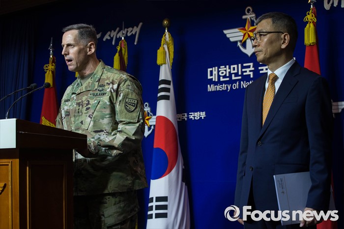(서울=포커스뉴스) 8일 오전 서울 용산구 국방부 브리핑실에서 류제승 국방부 국방정책실장(오른쪽)과 토머스 벤달 주한미군 8군 사령관(왼쪽)이 주한미군 사드(THAAD) 배치 결정과 주한민국의 사드 배치 가능성에 대한 공식협의 개시를 발표하고 있다.
