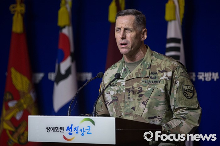 (서울=포커스뉴스) 8일 오전 서울 용산구 국방부 브리핑실에서 토머스 벤달 주한미군 8군 사령관이 주한미군 사드(THAAD) 배치 결정과 주한민국의 사드 배치 가능성에 대한 공식협의 개시를 발표하고 있다.