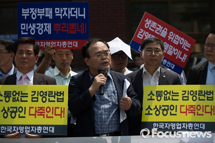 (서울=포커스뉴스) 한국자영업자총연대 등 소상공인 단체가 8일 오전 서울 종로구 효자동주민센터 앞에서 김영란법 시행 저지와 중소상공인 자영업자 발전대책 촉구 공동 기자회견을 하고 있다.