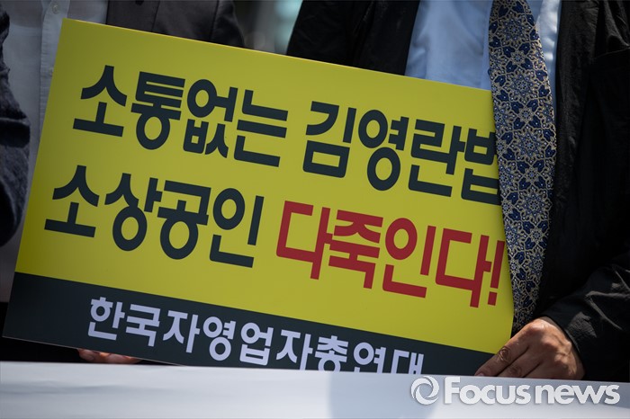 (서울=포커스뉴스) 한국자영업자총연대 등 소상공인 단체가 8일 오전 서울 종로구 효자동주민센터 앞에서 김영란법 시행 저지와 중소상공인 자영업자 발전대책 촉구 공동 기자회견을 하고 있다.