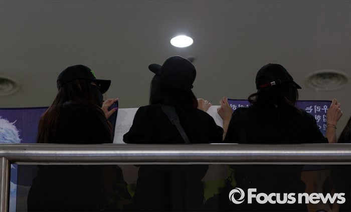 (서울=포커스뉴스) 8일 오후 서울중앙지방법원에서 전 여자친구와 민사소송 중인 가수 김현중의 홍콩, 일본, 중국 팬들이 김현중을 응원하는 손피켓을 들고 있다.