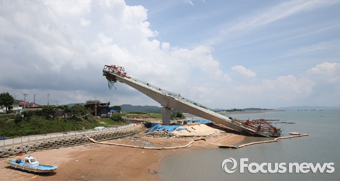 (영광=포커스뉴스) 8일 오전 전남 영광군 염산면과 무안군 해제면을 잇는 칠산대교 건설현장에서 상판 구조물이 무너져 노동자 6명이 부상을 입는 사고가 발생, 칠산대교는 가운데 교각을 중심으로 상판이 한쪽으로 기울듯 무너져 내려 있다.