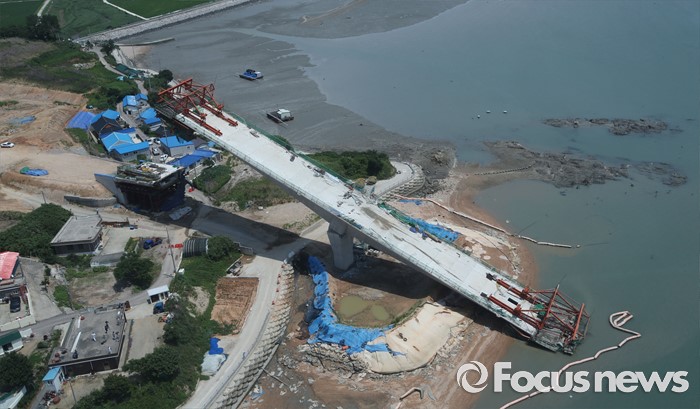 (영광=포커스뉴스) 8일 오전 전남 영광군 염산면과 무안군 해제면을 잇는 칠산대교 건설현장에서 상판 구조물이 무너져 노동자 6명이 부상을 입는 사고가 발생, 칠산대교는 가운데 교각을 중심으로 상판이 한쪽으로 기울듯 무너져 내려 있다.